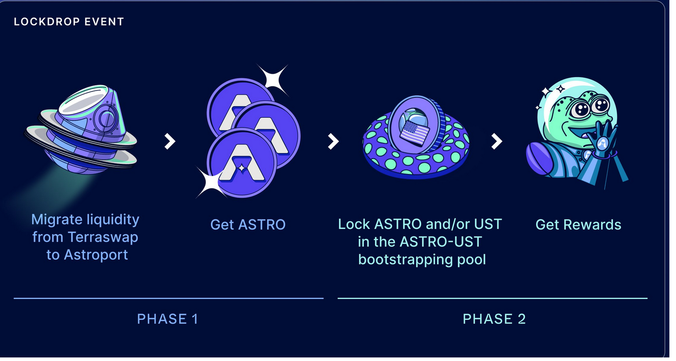 Phase 1 - An AstroDrop or “lockdrop” to Terraswap LPs who migrate Terraswap LP tokens from Terraswap to Astroport for a user-selected trial period.-