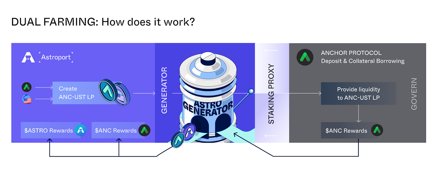 Astroport offers another attractive feature- dual liquidity mining. When LPs provide liquidity, they only earn one kind of reward. Astroport addresses this with smart contracts that enable simultaneous “dual farming” of $ASTRO tokens, an innovative way to leverage its use case.