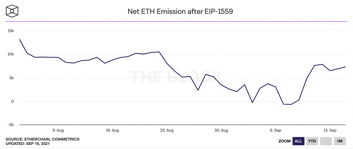 On Sep3, the net emission turned negative, making it the first deflationary day for ethereum network. More ETH was burned than the ETH being issued to miners. This can happen as the base fee adjusts upward during periods of higher demand for Ethereum transactions. This could be attributed to congestion on the network due to NFT minting which increases the base fee upwards.