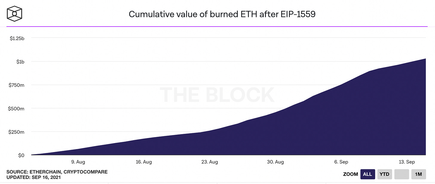 Ethereum blockchain has burned more than $1B in ETH, EIP-1559 upgrade was pushed on the network was an Ethereum Improvement Proposal that changes how fees are paid to miners & how ETH is issued. It works by standardizing fee payments using a base fee calculated on a network demand-basis to be burned. So if the network is under heavy usage, more ether will be burnt.